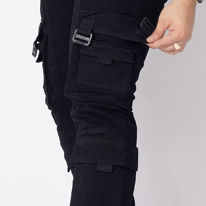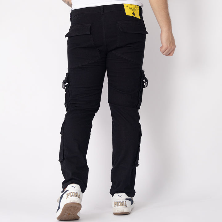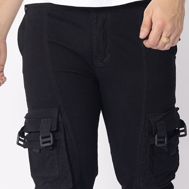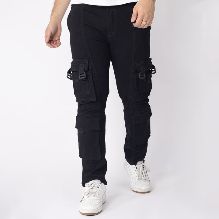Jeans cargo negro con tiras para hombre, diseñados con bolsillos utilitarios y detalles ajustables que aportan un toque urbano y moderno. Confeccionados en denim de alta calidad, con un corte recto que brinda comodidad y estilo. Perfectos para un look versátil y vanguardista, combinan idealmente con camisetas, chaquetas y sneakers.